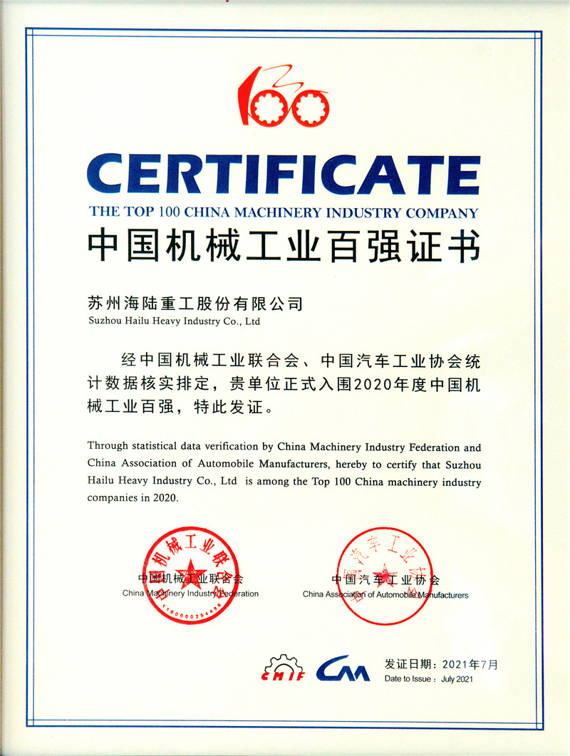 蘇州海陸重工股份有限公司榮獲“中國機械工業百強企業”榮譽稱號